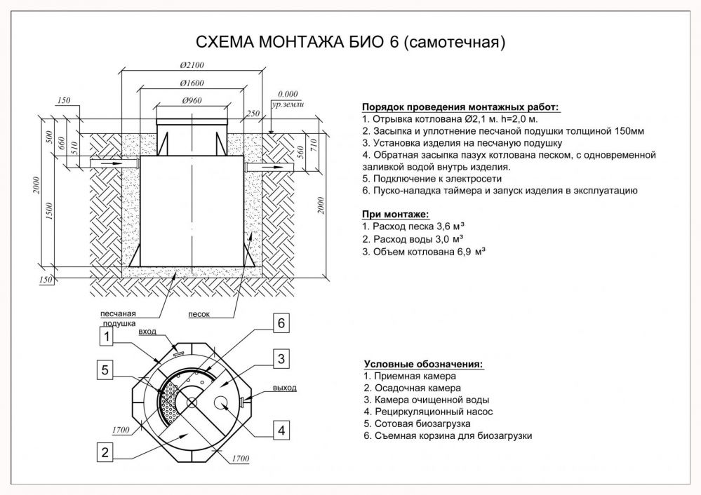 Септик Астра 6 создан согласно системе all-in: все оборудование размещается в главном баке. Конструкция состоит из пяти разделенных перегородками камер — четырех рабочих (приемная, аэратор, также называемый аэротенк, отстойник чистой воды пирамида, стабилизатор-илосборник) и одной, вмещающей все электрическое оборудование: компрессор, клапан для регуляции его работы, блок управления. Перемещение жидкости осуществляется по трубкам насосов эрлифтов. Их четыре: основной, для циркуляции, для рециркуляции, штатный с заглушкой (необходим для ручного откачивания избыточного количества иловой массы). Для наиболее эффективной очистки и предотвращения засоров в комплектацию установки входят еще жироуловитель и фильтр крупных фракций.